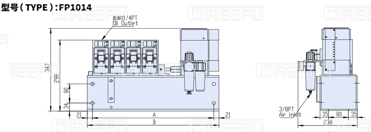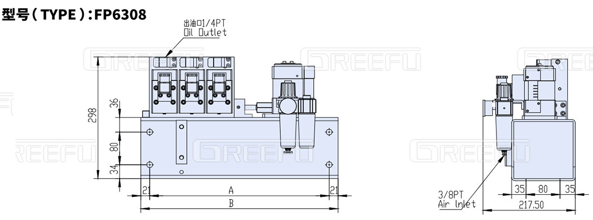 氣動式油壓單元FP1014,利用空氣壓力驅動泵浦, 由單體泵、壓力開關、電磁閥、氣控閥、 氣源處理器、油箱等組成